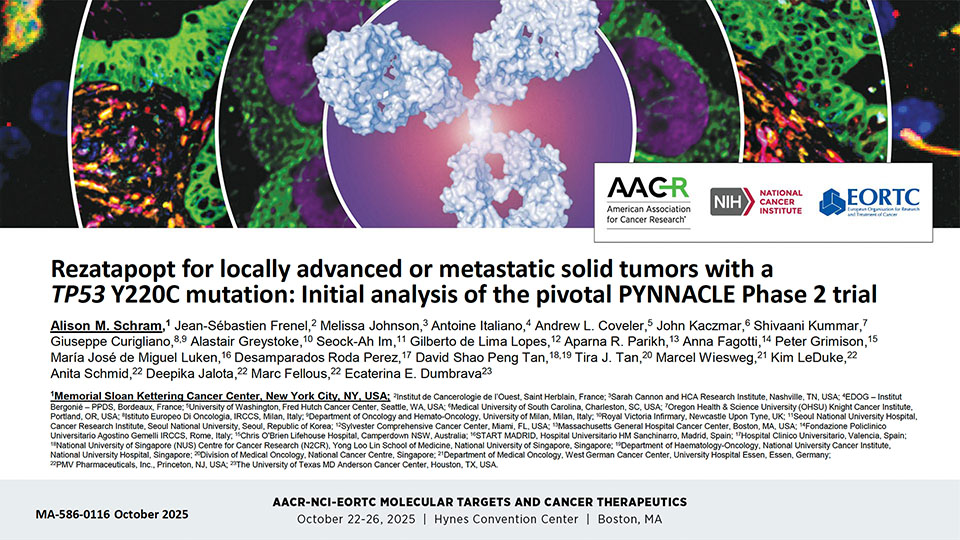 References: 1. ClinicalTrials. gov. NCT04585750. The evaluation of PC14586 in patients with advanced solid tumors harboring a p53 Y220C mutation. Available at: https://clinicaltrials.gov/study/NCT04585750. Accessed September 2024; 2. Dumble M, et al. Oral presentation at AACR 2021, Virtual. April 10–15, 2021; 3. Dumbrava EE, et al. Oral presentation at ASCO 2022, Chicago, USA. June 3–7, 2022; 4. Schram A, et al. Poster presentation at AACR-NCI-EORTC 2023, Boston, USA. October 11–15, 2023.