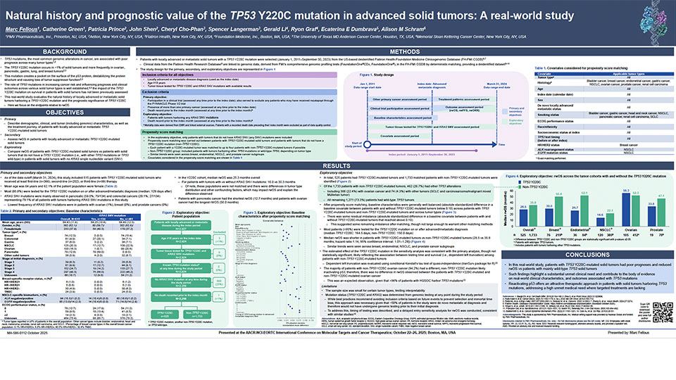 The TP53 Y220C mutation is a potential treatment target in cancer and has been identified in over 30 different solid tumor types.1–5 Under normal conditions, p53 is a tumor-suppressor protein and has a key role in disrupting tumor progression.6,7 The mutated p53 Y220C protein forms a small pocket on the surface of the p53 protein, which causes the protein to lose its structural shape; this results in a loss of function, and can lead to tumor progression.1–3,8